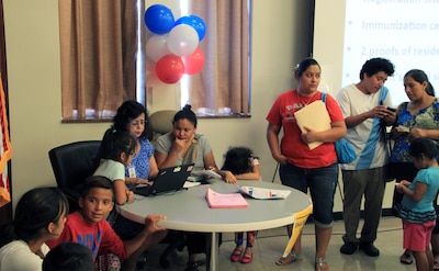 Eleven-year-old Roxanna Vasquez huddled with her family around a computer during the online student registration kickoff event Monday at the Shelby County Schools Board of Education building in Memphis.