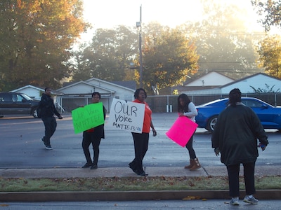 Parent advocacy organization Memphis Lift was at Memphis Academy of Health Sciences High School to protest firing a beloved principal and teacher. (Laura Faith Kebede/Chalkbeat)