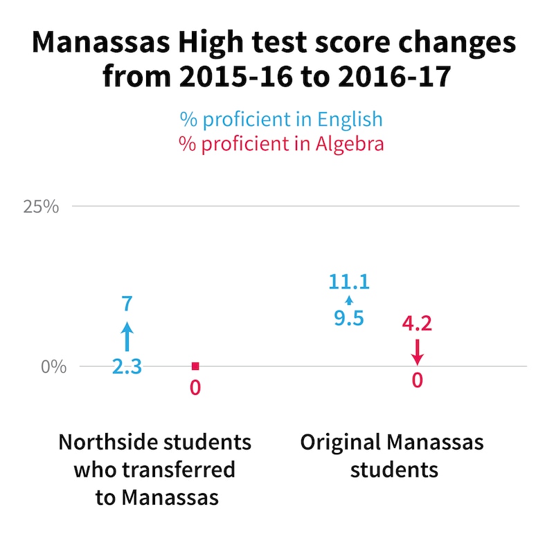 Of those former Northside High students, the percent of students on grade level increased by about 5 percentage points, but algebra test scores remained flat. Other students at Manassas High saw a small increase in reading scores, but algebra proficiency dropped from 4 percent to 0 percent, according to the district’s analysis.
