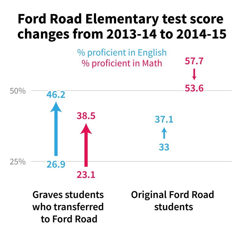 While reading scores for the rest of Ford Road Elementary rose about four percentage points during that year, math scores dipped at the same rate, according to the district’s analysis.