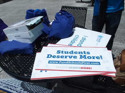 As county commissioners were discussing more money for schools, about 30 people rallied outside chanting “fund students first” to urge county leaders to fulfill the district’s request.