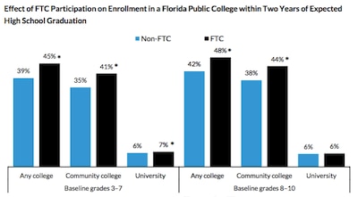 The paper estimates that participating in the tax credit program raised enrollment in Florida public colleges by about 6 percentage points, with virtually of all of the increase coming from community colleges. Students who used the tax credit in an earlier grade were half a percentage point more likely to enroll in a public four-year college.