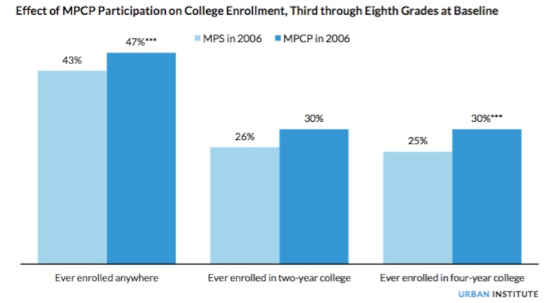 The research looks at how students from Milwaukee and Washington, D.C. fared after using a voucher to attend private school. It found students in Milwaukee’s voucher program were more likely to attend four-colleges, but not necessarily more likely to actually graduate. In D.C., voucher recipients were no more likely to enroll in college.