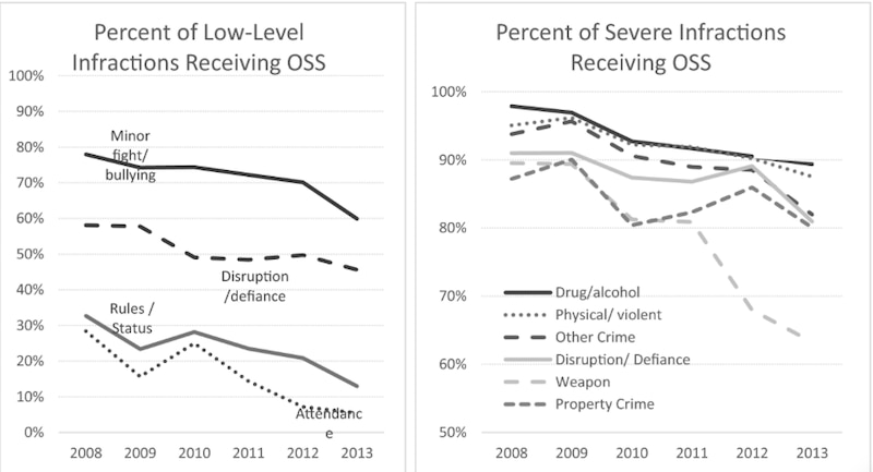By 2013, the share of severe offenses in Chicago schools that resulted in out-of-school suspensions dropped from 93 percent to 84 percent in high schools. The share of lower-level weapons violations, like having a box cutter, resulting in out-of-school suspensions dropped more sharply. Students often earned in-school suspensions instead, keeping them in their school building but not their specific classrooms.
