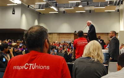 “You are demanding, and I am demanding, a change in national priorities,” Sanders told hundreds of teachers, support staff, and other union members at the teachers union’s packed hall.