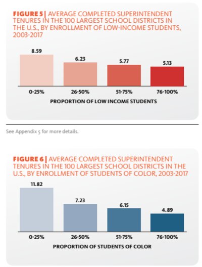 Then there’s the fact that certain districts — namely those with more low-income students and more students of color — see much more churn than others. As far as stable leadership goes, students who may already lag behind are more often in districts that lack it.