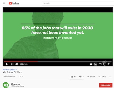 At XQ’s 2018 annual symposium, futurist Heather McGowan repeated a prediction that 65% of the jobs of the future hadn’t been created yet, though she acknowledged that the statistic was “debatable.” A promotional video released by XQ months later made a similar prediction: “Eighty-five percent of the jobs that will exist in 2030 have not been invented yet,” the XQ narrator declared.