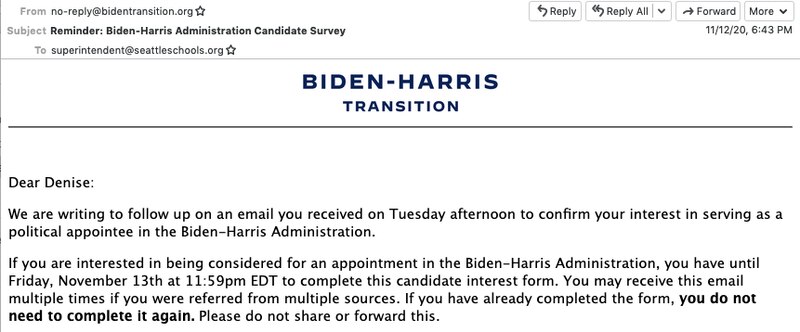 In fact, Juneau received an email Nov. 10 from an unnamed member of the president-elect’s appointments team. “Your name was referred to us as someone who may be interested in serving as a political appointee in the Biden-Harris Administration,” the email said. It then encourages Juneau to fill out a “candidate interest form” by the end of the week. A follow-up email Nov. 12 reminded Juneau to apply.