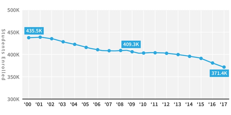 The roughly 371,000 students enrolled at CPS this year is a 15 percent decrease compared with the year 2000, when enrollment topped 435,000, according to CPS data. And there’s no sign the numbers will trend upward soon: The district projects about 20,000 fewer students to enroll in the next three years. The trends mirror population drops in Chicago, which has about 182,000 fewer residents than it did 18 years ago, according to Census data. More than 220,000 black residents have left since the year 2000.