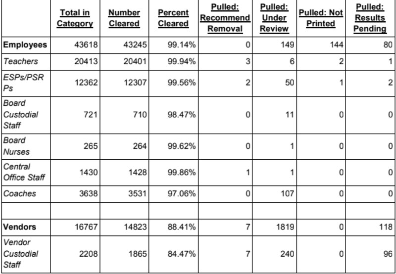 Out of the district’s 20,413 teachers, 99 percent have cleared fingerprint-based background checks.