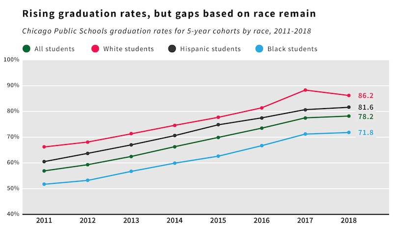 Graduation rates at Chicago schools continued to rise this past school year to reach what district officials described as a record high — but gaps separating students by race persist, and the district still significantly trails national averages.