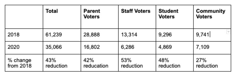 This year, district officials blamed lower-than-expected turnout on the COVID-19 pandemic. They said they had taken “unprecedented measures” to make voting accessible, including mail-in ballots for parents and staff, digital voting for students, and curb-side voting options for in-person ballots.