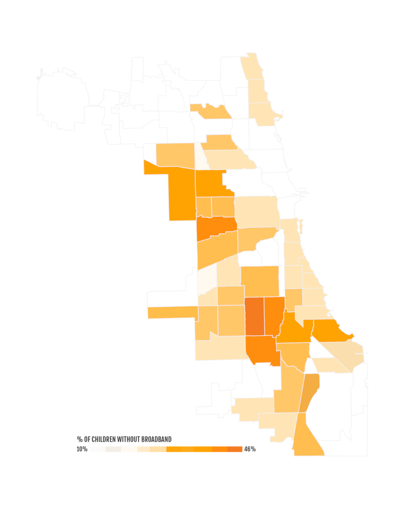 Nearly half of school-age children in West Englewood lack broadband access, the highest percentage of the city’s 77 neighborhoods. That was followed by Englewood (38%), Auburn Gresham (38%), and North Lawndale (37%).