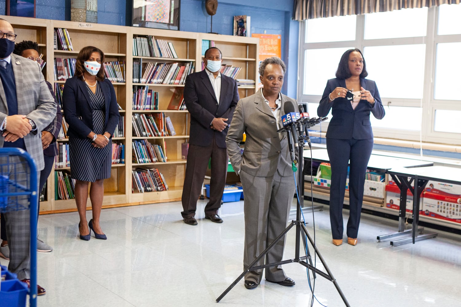 At an eerily quiet South Side elementary school on Tuesday morning, Mayor Lori Lightfoot and schools chief Janice Jackson toured classrooms with the principal and passed out caramel apples to a handful of teachers who opted to come in and take advantage of a district policy that lets educators work from school buildings.