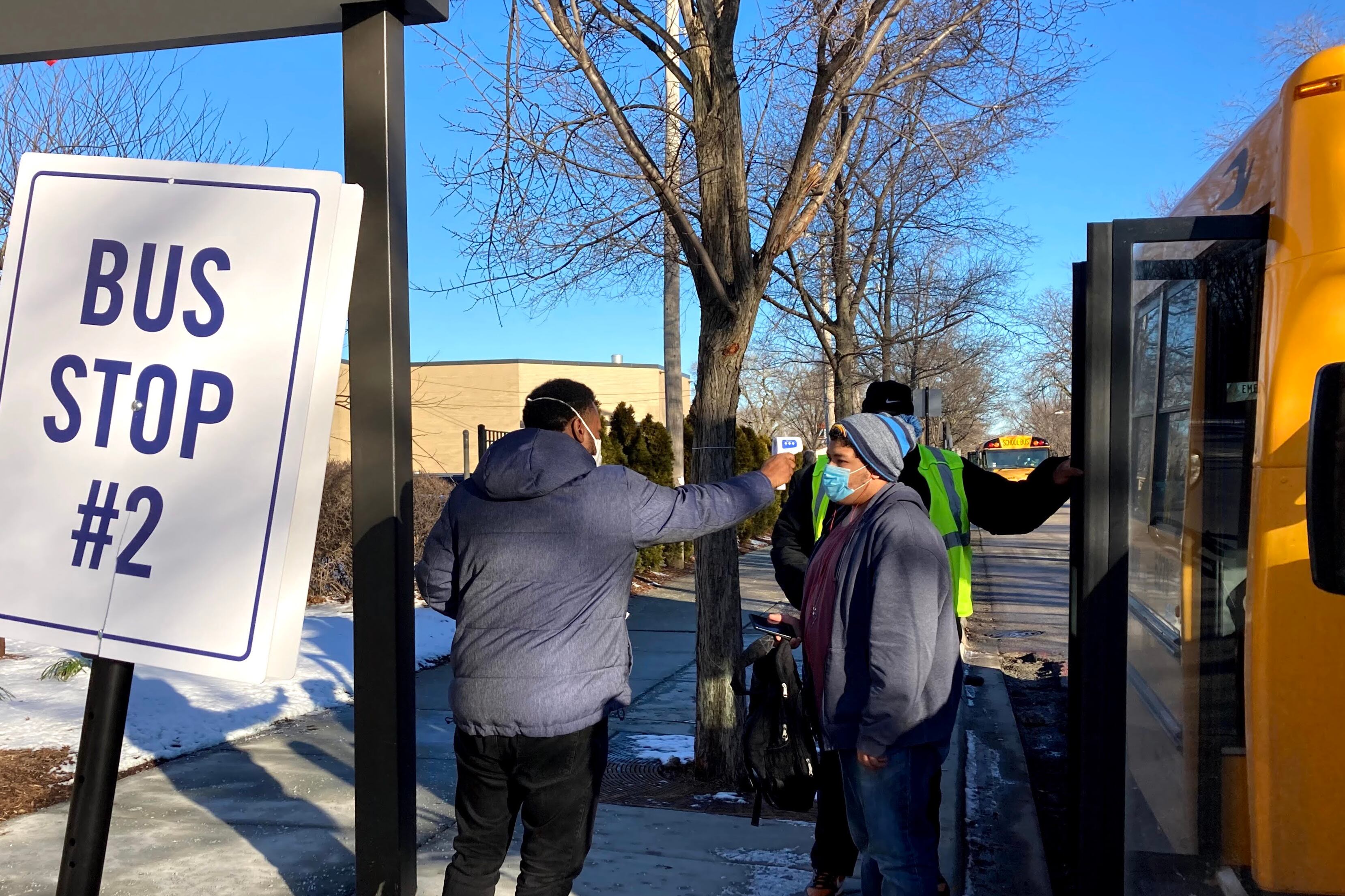 Students, who already had gotten a temperature check before boarding the bus, paused after getting off to get checked again. Some lifted their winter hats off their foreheads to help. Then, they hurried inside the building to check-in stations, where they had their temperatures checked a third time and completed the district’s daily health screener, if needed.