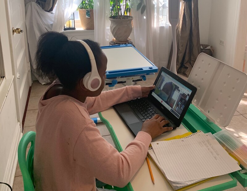Zamara (pictured above), who continued learning from home when school buildings reopened, found the first week of hybrid learning in Chicago difficult. The first thing she noticed as other students returned to the classroom was that her in-person teacher had additional demands on her time.