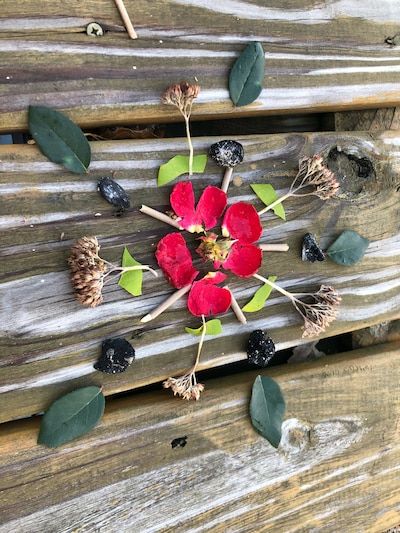 Another gallery is titled “Earthworks”, that features photos and other pieces that show peaceful spaces the students created with found objects in nature. The exhibit is bookended by the two kinds of self-care performance scores the students crafted: silence and noise. (“You will come across everything from harmonious beats to rattling explosions.”)