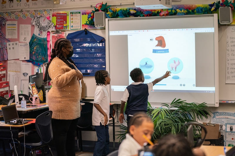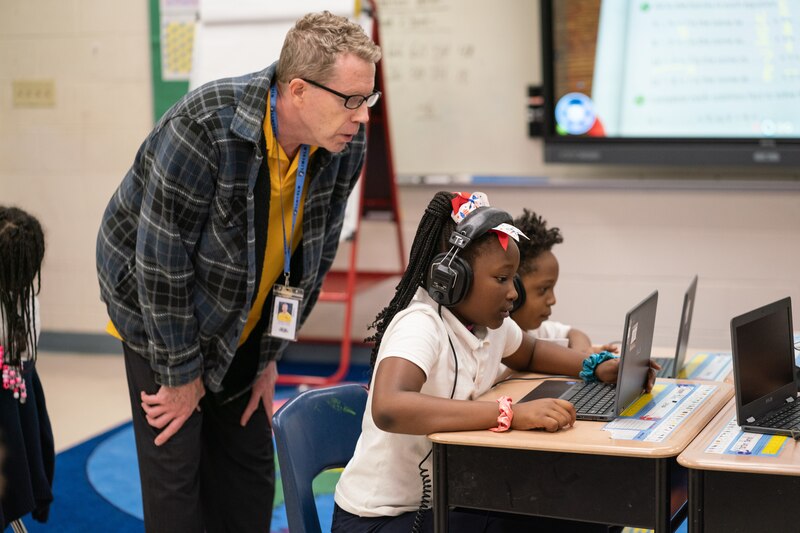 Veteran educators such as Anita Pennington can be found at an interactive whiteboard, working on rhyming words with a pair of struggling second grade readers while their classmates do a reading comprehension exercise on their Chromebooks.