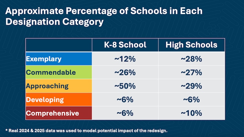 A draft of the accountability redesign posted by the Illinois State Board of Education indicates there would still be five labels, but their names would change slightly. The proposed changes would eliminate the use of the 9th-grade On-Track metric, which measures the percentage of freshmen likely to graduate based on their attendance and grades.