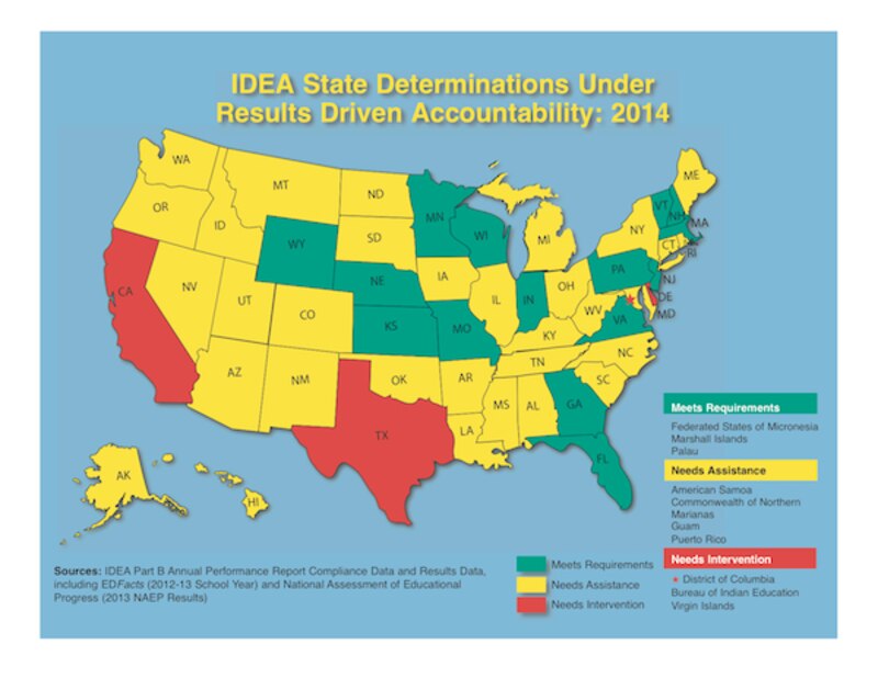Under the Individuals with Disabilities Education Act (IDEA), the federal government must monitor states and place them in one of four categories: meets expectations; needs assistance; needs intervention; and needs substantial intervention. Last year, nearly all states met expectations.