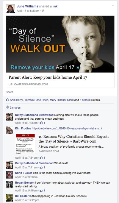 Earlier in the week, Jeffco officials provided schools with guidance on how to respect students who were participating in the Day of Silence. The guidance was approved by the Jefferson County Education Association.