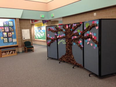 The copy room has been converted into part of a fourth-grade classroom for 30 students. The copiers were moved into the hallway, hidden behind a gray-colored temporary wall. Another temporary wall functions as a tiny makeshift classroom for kids who need extra help.