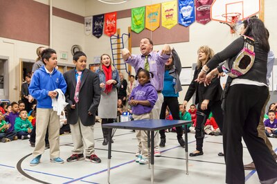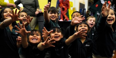 The kids started a recent Monday by gathering in the gymnasium of the squat, blond brick elementary school building. Dressed in bright red, blue, green, yellow and orange shirts stamped with the school name, they cheered the Denver Broncos’ Super Bowl win and gave each other shout-outs and awards before heading to class in neat lines.