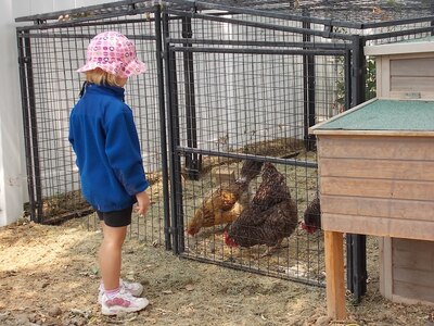 Abby Miller, the director of a Montessori preschool in Boulder County, said her center’s four chickens—Ginger, Tilly, Dandelion and Twinkydink—live in a fully enclosed pen. The children can collect eggs from a nesting box accessible from outside the pen, but they don’t walk in the pen or pick up the chickens. And they always wash their hands after collecting eggs.
