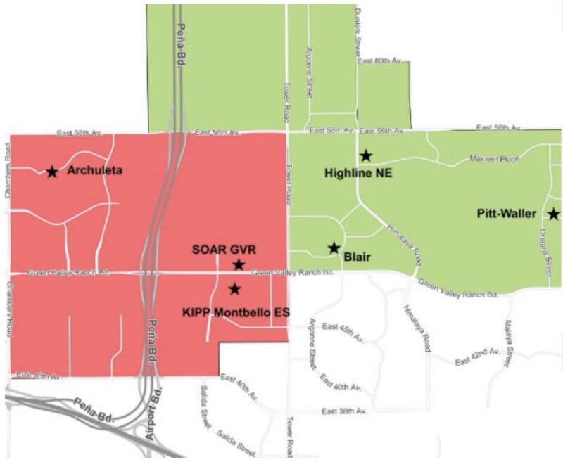 The district’s proposal is to create two enrollment zones on either side of Tower Road. Each would have three schools in it. The zone to the west of Tower Road would encompass Archuleta, SOAR at Green Valley Ranch and KIPP Northeast. The zone to the east would encompass Omar D. Blair, Highline Academy Northeast and Florida Pitt Waller.
