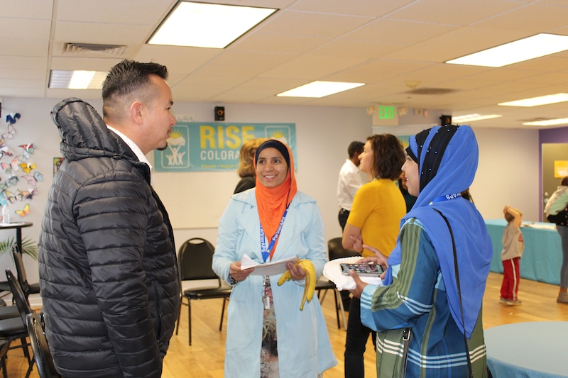 Efren Ortiz, the district’s langauge services coordinator, speaking with Salamah Bibi and Husanara Makbul Hussin. (Photo provided by RISE Colorado)