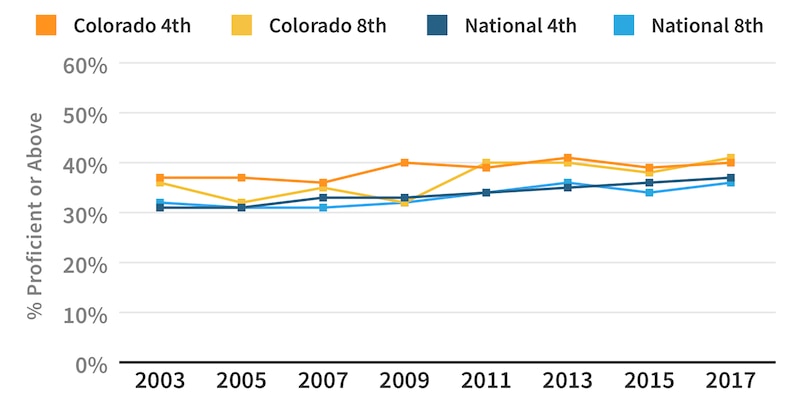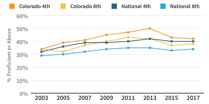 In math, 42 percent of Colorado fourth-graders and 38 percent of Colorado eighth-graders scored proficient or better in 2017. In reading, 40 percent of Colorado fourth-graders and 41 percent of Colorado eighth-graders scored proficient or better.
