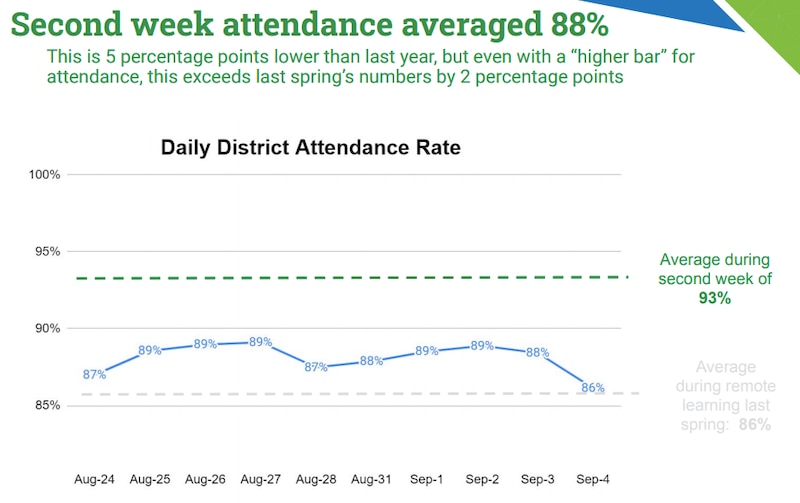 Average daily attendance over the first two weeks of school this fall was about 88%. While that’s higher than during springtime remote learning, it’s about 5 percentage points lower than the same period in 2019, when attendance in classrooms was 93%.