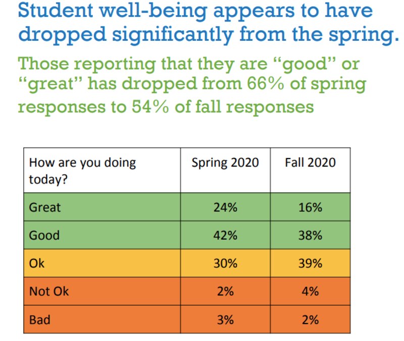 But the results of a student survey are troubling. Fewer students reported that they’re doing “good” or “great” when asked about their well-being. Only 54% of students said they were “good” or “great” this fall, down from 66% in the spring, district data shows.