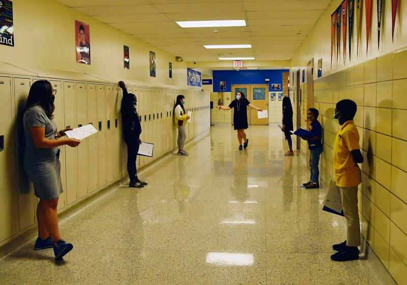 Two rows of middle school students, each with their backs against opposing walls, stood on spaced out “X”s in the hallway at North Middle School in Aurora on Friday.