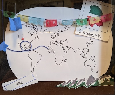 It marks the place she grew up, Boulder, and highlights Chihuahua, Mexico, where her mother’s family comes from and where many of her family members still live. Then there’s a loop, with an arrow representing Isa’s hope to one day travel and see more of the world. Across the map, she draped papel picado, a colorful cut-out flag banner common in Mexican celebrations.
