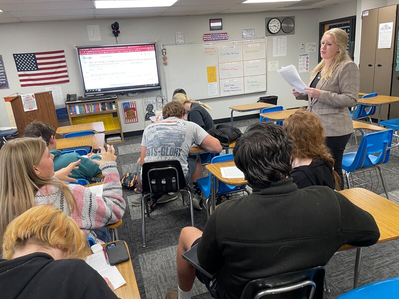 Teacher Sarah Malerich read a letter to the students gathered in her history classroom in the southeastern Colorado town of Kiowa.