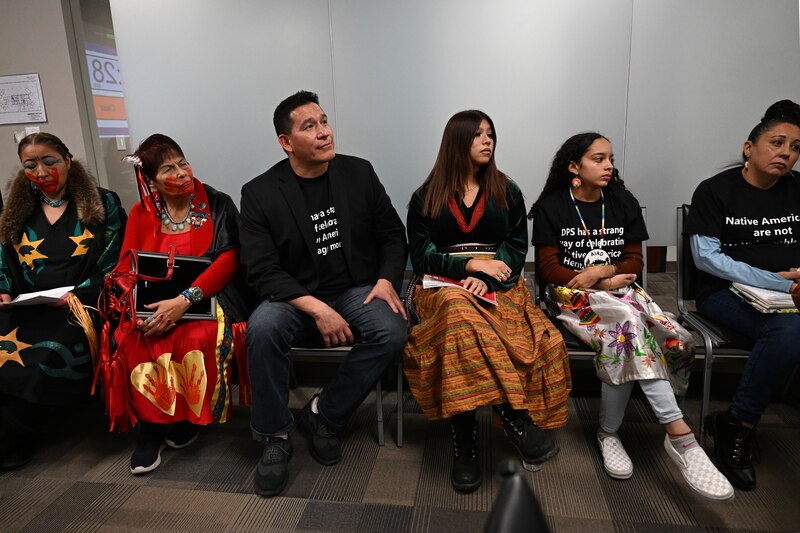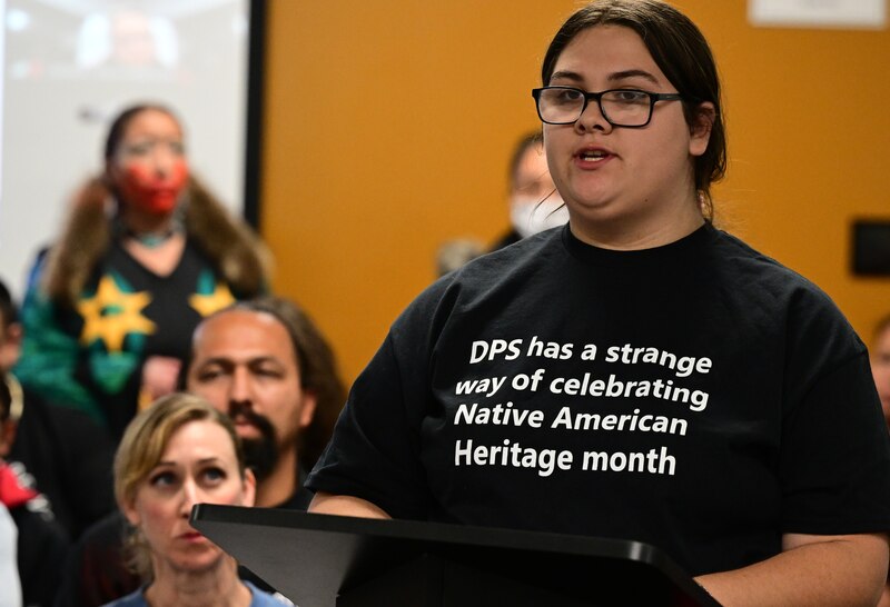 Native American students told stories of being bullied in their previous schools but not at AIAD. They introduced themselves in Navajo and Lakota, and their parents spoke of the power of restoring those languages to their families. Community members wore black T-shirts that said, “DPS has a strange way of celebrating Native American Heritage Month.”