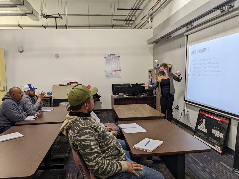 En una de las clases para principiantes, los estudiantes que trabajan en BrightView Landscape asisten a una clase en el campus universitario al norte de Denver. Esta compañía de landscaping se asoció con la universidad para enseñarles inglés a sus empleados y que puedan comunicarse mejor en el trabajo y también progresar.