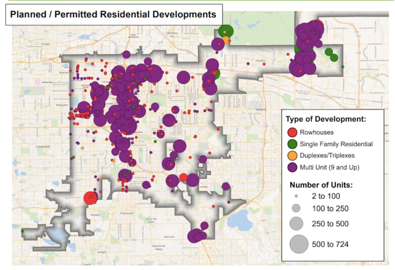 The map below shows that most new housing will be condos, apartments, and townhomes, which historically yield fewer students than do single-family homes. Some areas of the city like southwest Denver have little new development planned. “As a result, higher housing prices are driving families out of the region while non-child households are moving in,” the report notes.