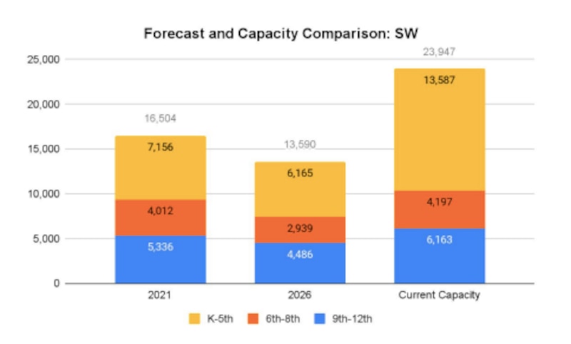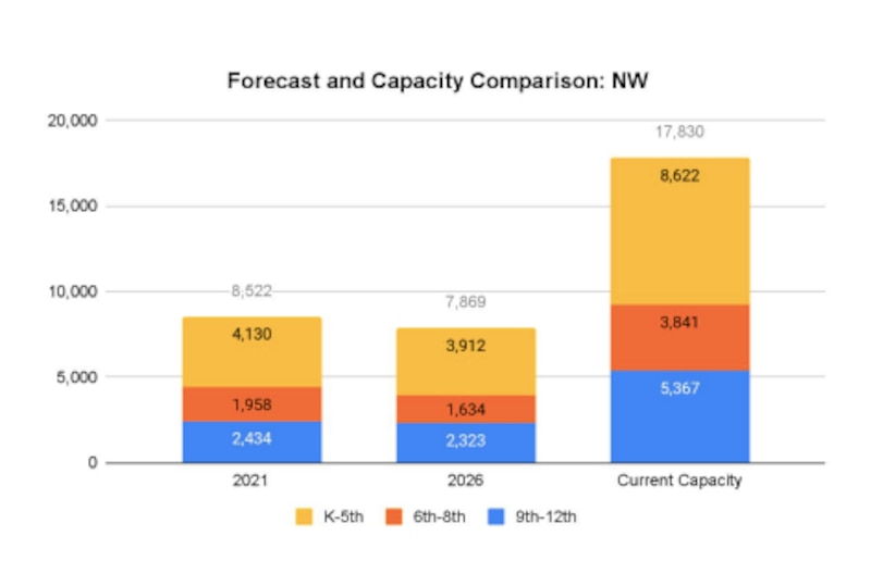 Currently, northwest Denver has the largest surplus at about 9,000 unfilled seats, though both northwest and southwest Denver are predicted to have more empty seats by 2026.