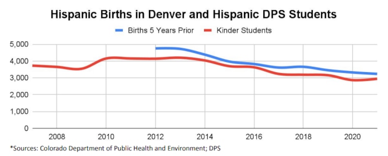 Hispanic students make up more than half of the students in Denver Public Schools, and the report notes that the decline in births among Hispanic families “will have a significant negative impact” on district enrollment. Birth rates among non-Hispanic families, many of whom are white, are actually slightly increasing. But white families are less likely than Hispanic families to enroll their children in public schools.