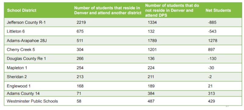 The number of students who live outside Denver and transfer into Denver Public Schools is higher than the number of Denver students who transfer out to other districts. This year, the net gain for the district was about 1,350 students, the report says. Denver loses the most students to Jeffco Public Schools and gains the most students from Aurora Public Schools, which is listed on the chart below by its official name, Adams-Arapahoe 28J.