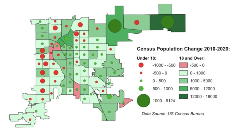 Lower birth rates are one of the primary drivers of enrollment decreases, the report concludes. The chart below shows population changes in Denver from 2010 to 2020, according to the U.S. Census Bureau. The red dots show decreases in the population of children under 18. Falling mostly in the west and north of the district, the red dots follow a familiar pattern that Denverite has described as an “inverted L” that “illustrates stark physical and socioeconomic barriers in the city.”