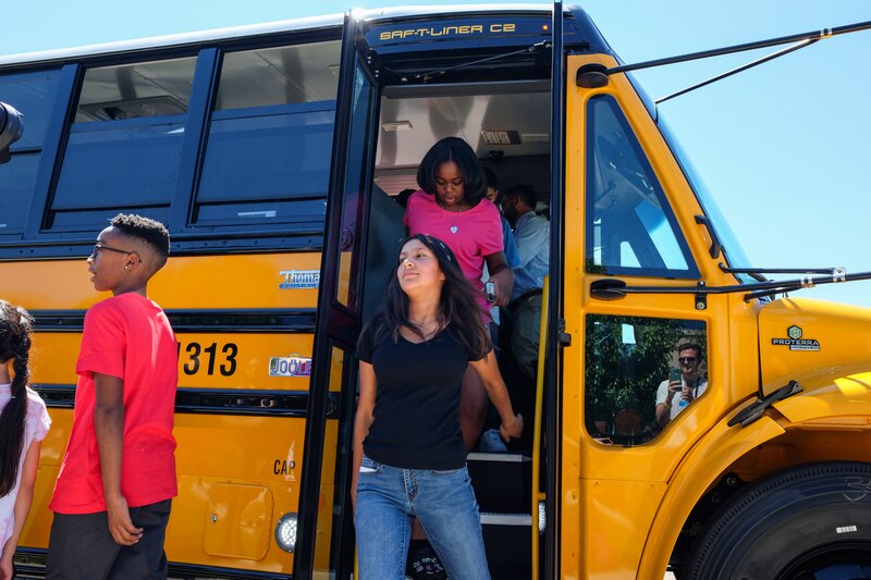 Aurora students disembark from an electric school bus after a ride around the Edna and John W. Mosley P-8 campus. (Erica Meltzer / Chalkbeat)