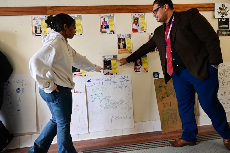 Besides teaching Arabic and planning the expansion of the program, Moghazy also mentors a handful of newer immigrant students who speak Arabic. Teachers for other content classes send him assignments that he translates for the students so they can participate.