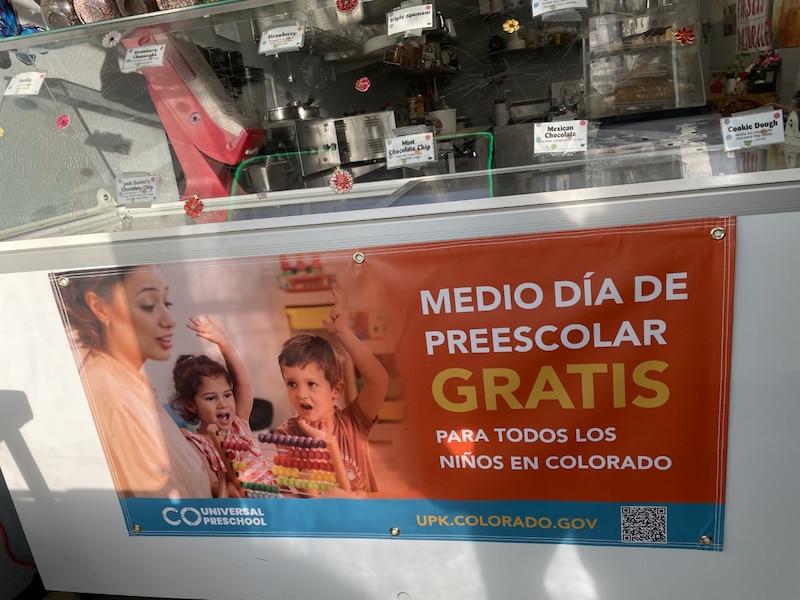 Los letreros grandes dicen “Medio día de preescolar gratuito para todos los niños de Colorado” e incluyen un código QR y un enlace a la página web del preescolar estatal. Un cartel más pequeño en español señala que los niños que empiezan Kinder sin preparación tienden a quedarse rezagados y exhorta a los padres a “asegurar que sus hijos estén listos”.