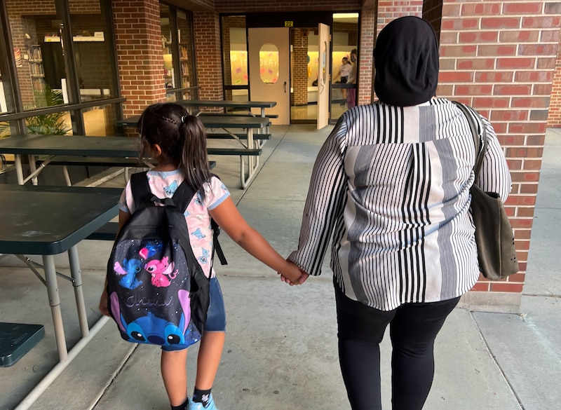 When Sara and her mom pulled up Monday, the 7-year-old immediately recognized several staff members who were standing outside with walkie talkies, greeting families.
