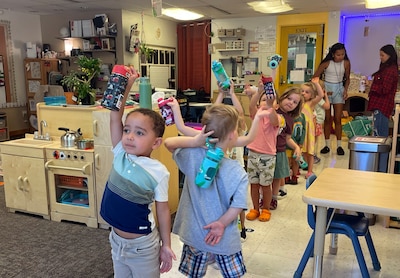 A little girl in a pink and green sundress said her favorite part of preschool is “using scissors” — purple glittery scissors, to be exact.