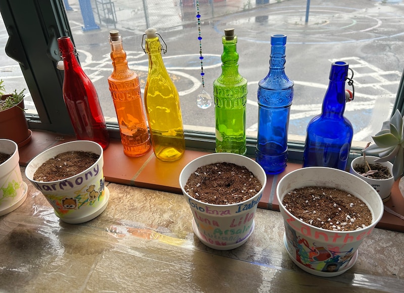 Stavros, a 4-year-old at Denver’s Palmer Elementary School, stood on a low blue chair scooping soil into a white pot he’d decorated with his school picture and stickers of a donut, a camera, and the word “lucky.” Next, he shook in a packet of seeds for wildflowers native to Colorado and swirled them around with his index finger.