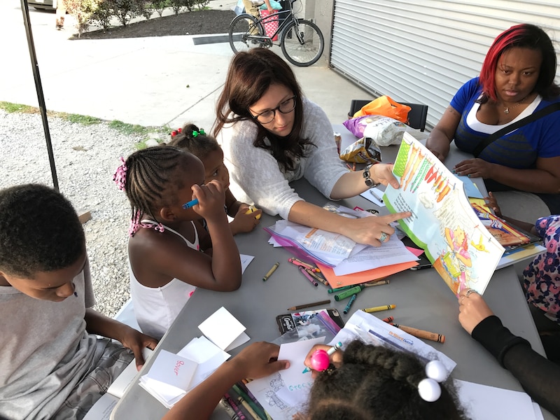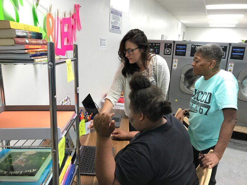 Now, there are books for kids to read — and take home — near the washing machines. There are computers stocked with educational software. And, a few times a week, there’s a picnic table in the parking lot where instructors read to children and work with them on their writing skills.